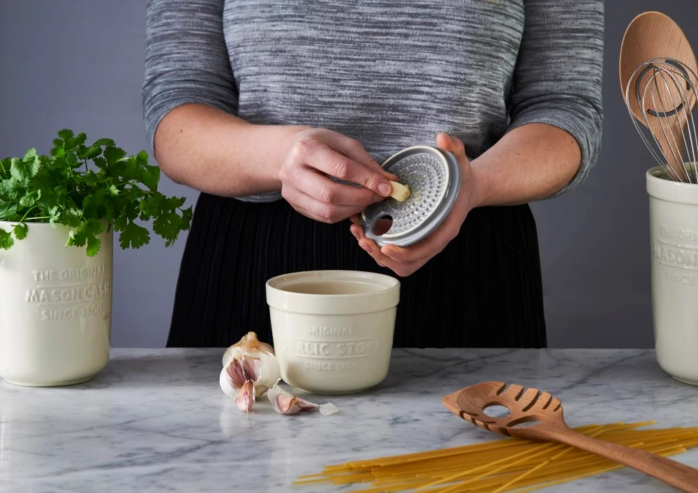 Nádoba na skladovanie cibuľovín, cesnaku alebo čerstvého ďumbieru (zázvoru), so strúhadlom vo vrchnáku, kolekcia Innovative Kitchen Mason Cash