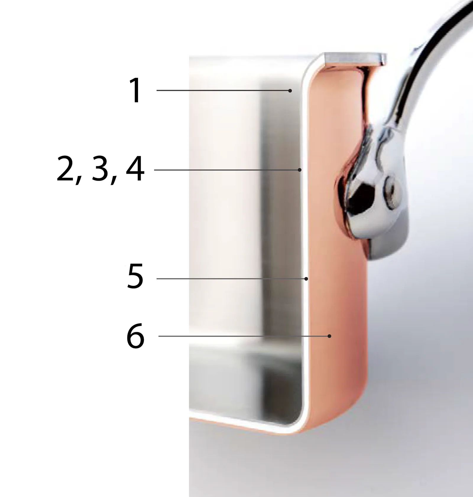 Vnútorná vrstva je tvorená nehrdzavejúcou oceľou 18/10, ktorá umožňuje ľahké čistenie. Potom nasledujú 3 vrstvy hliníka, ktorý je rovnako ako meď výborným vodičom tepla. 5. vrstvu tvorí magnetická nehrdzavejúca oceľ, ktorá reaguje s indukčnou varnou platničkou, a 6. viditeľnú vonkajšiu vrstvu zase samotná meď, ktorá je nielen dizajnovo nádherným materiálom, ale tiež vynikajúcim vodičom tepla, veľmi rýchlo reagujúcim na zmeny teploty. Týmto spôsobom je zaistená rýchla a skutočne rovnomerná distribúcia tepla aj úplne dokonalá kontrola nad pripravovaným pokrmom. Jednoducho, perfektná voľba pre vaše kulinárske zázraky v kuchyni!