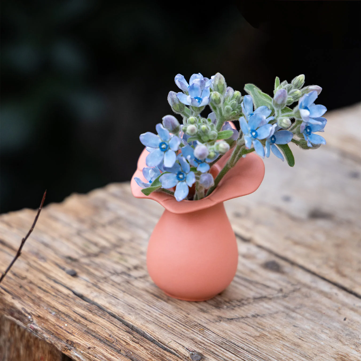 9 cm vysoká porcelánová vázička v tvare kvetu, v korálovej farbe, zhodou náhod takmer identické s broskyňovo-ružovou farbou roka 2024 peach fuzz. Súčasť tohtoročnej novej kolekcie porcelánových miniváz, inšpirované úspešnou zberateľskou edíciou Sixty & Tvelwe.
