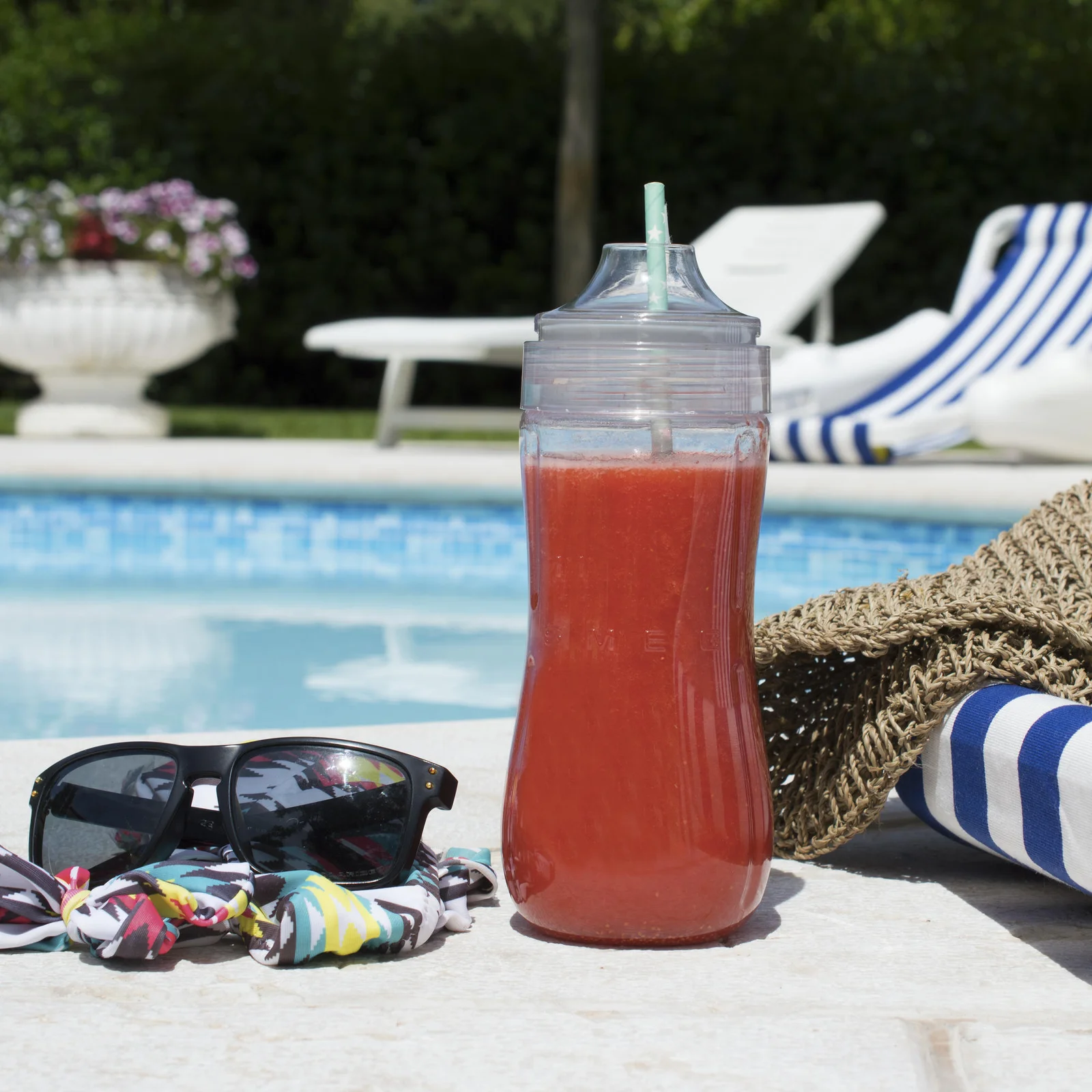 Použitie je veľmi jednoduché a účelné: do 600 ml cestovnej fľaše z Tritanu ™ prelejete obľúbený nápoj, ktorý jepripravený vo vašom mixéri. Ak tušíte, že fľaša nebude vždy vo vertikálnej polohe, naplníte ju len do 3/4 jej kapacity, teda do 400 ml. Uzavrite nepriepustným vrchnákom a máte zbalené na cesty kamkoľvek - do práce, do školy, na tréning, na detské ihrisko, na výlet, na piknik alebo na kúpalisko.