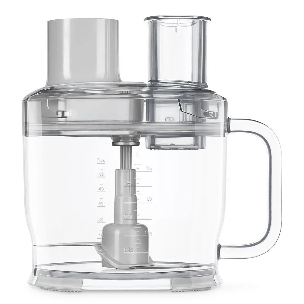 Prídavný food processor, kompatibilný s tyčovými mixérmi Smeg. Pracovná nádoba 1,5 litra. Nastaviteľný plátkovací kotúč, obojstranný strúhací kotúč na jemné a hrubé strúhanie, kotúč na šľahanie a emulgáciu a sekací nadstavec.