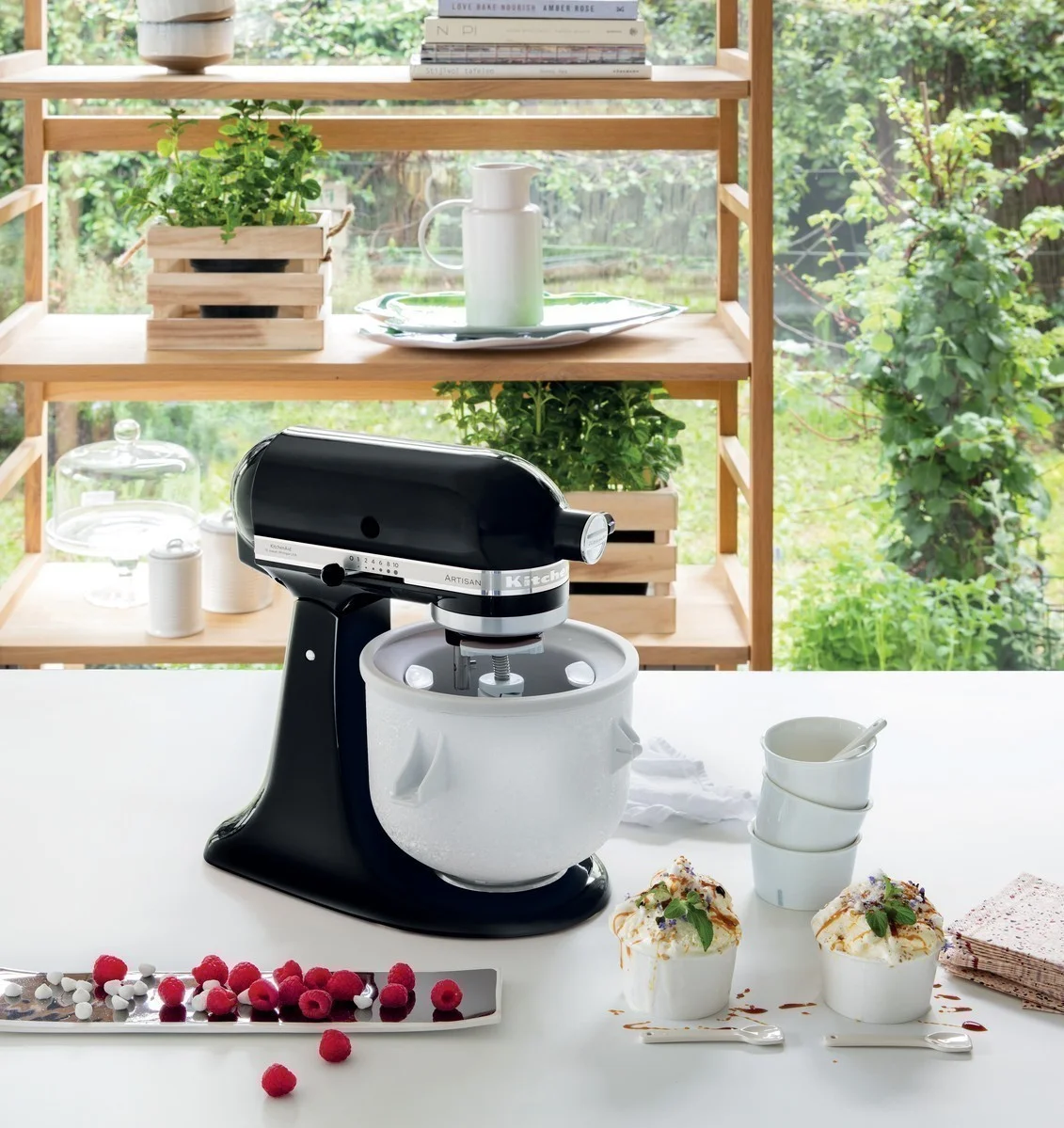 Kuchynský robot Artisan KSM125 od KitchenAid vo farbe čierneho polodrahokamu onyxu, s kompletným príslušenstvom na výrobu zmrzliny a sorbetov. Balenie okrem štandardne vybaveného robota obsahuje mraziacu misu, miešadlo a pohon pre zmrzlinovač. Skrátka dokonalý tichý spoločník pre nastávajúce teplé a letné dni.
