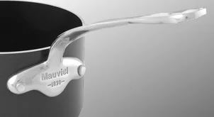 Pevné spojenie rukoväte pomocou nerezových nitov a elegantným plieškom s logom exkluzívnej značky Mauviel 1830.