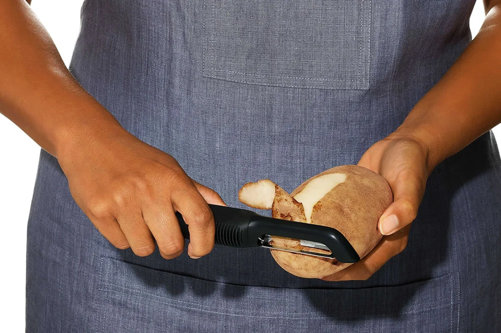 Škrabka je z kolekcie Good Grips, a tak nie je prekvapením, že veľká pozornosť bola venovaná rukoväti. Mäkká rukoväť skvele padne do každej ruky – malej aj veľkej, a vyhovuje pravákom aj ľavákom. Vďaka dômyselným protišmykovým prvkom nevykĺzne ani z mokrých rúk, navyše mierni nárazy a predchádza únave aj pri opakovaných pohyboch pri lúpaní. Škrabku môžete zavesiť, aby bola vždy po ruke. Ľahko sa čistí a môžete ju umývať aj v umývačke riadu.