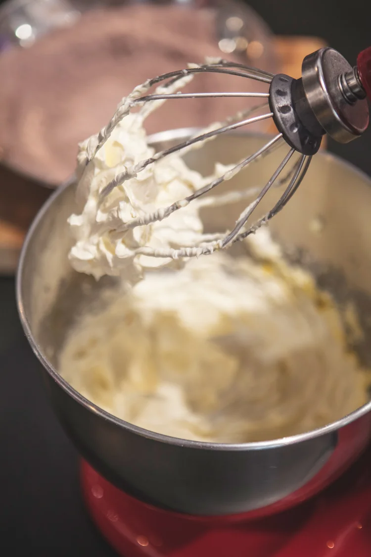 2. Do zľahka nahriateho masla pridáme cukor a šľaháme pomocou metličky do pevnej bielej peny.