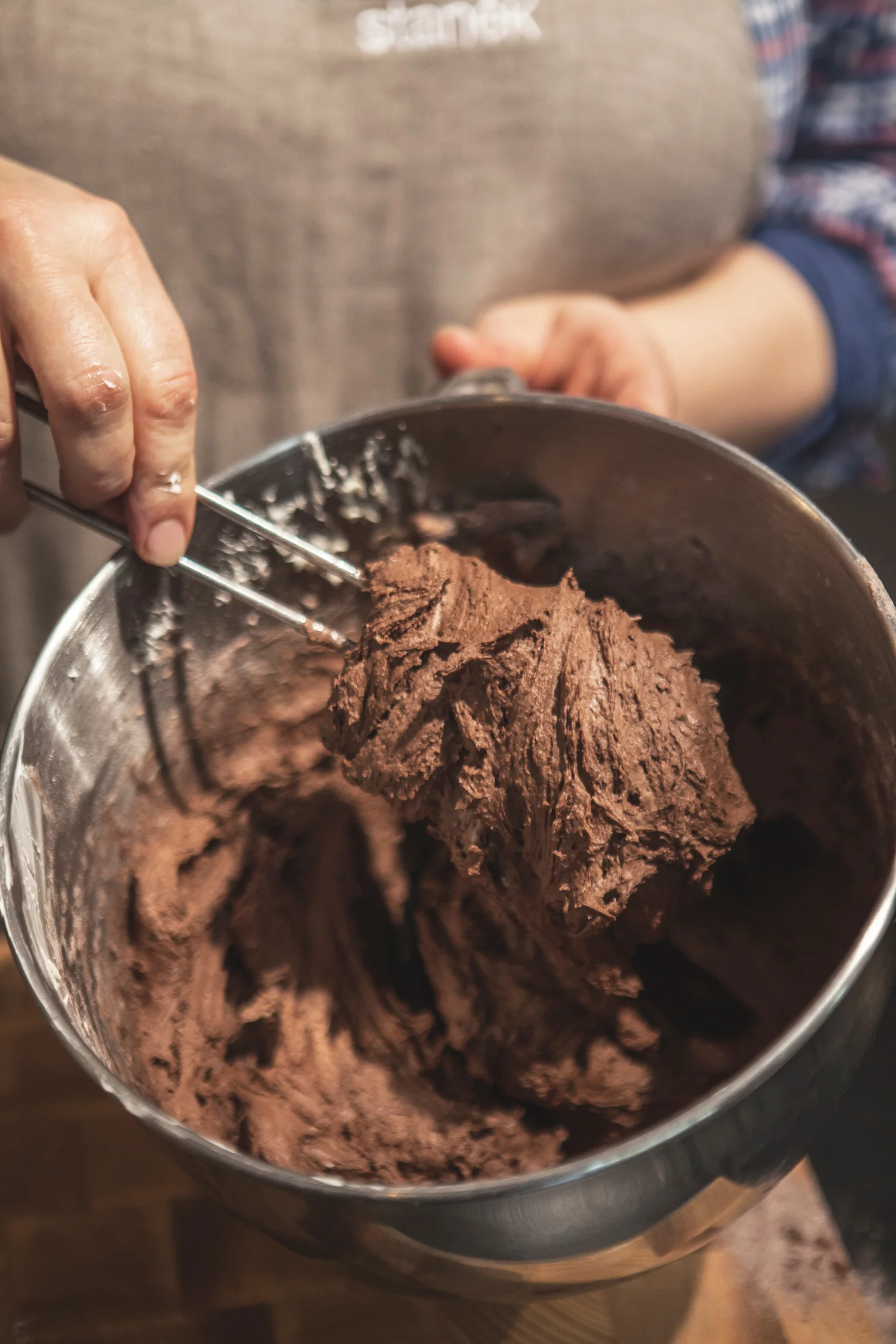 3. Do maslovej peny prišľaháme vajcia a potom ručne pomocou gumovej stierky zamiešame preosiatu a premiešanú suchú zmes (kakao s múkou a rozmarínom).