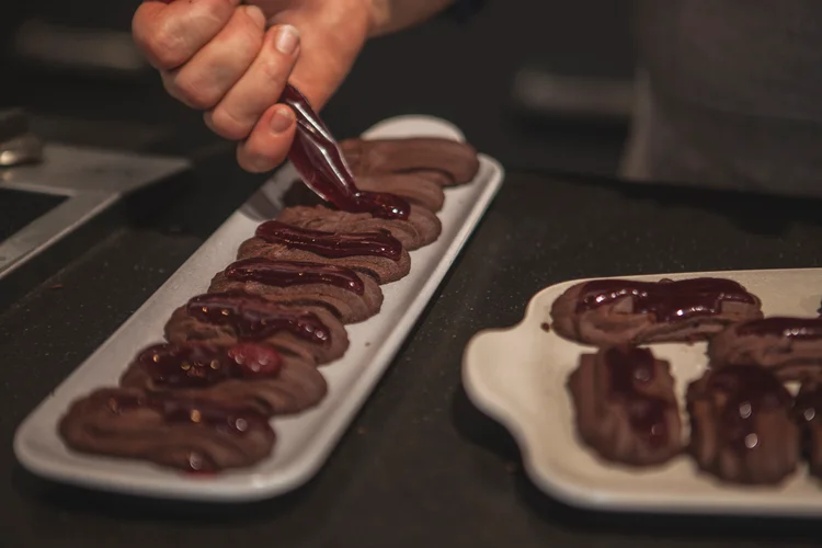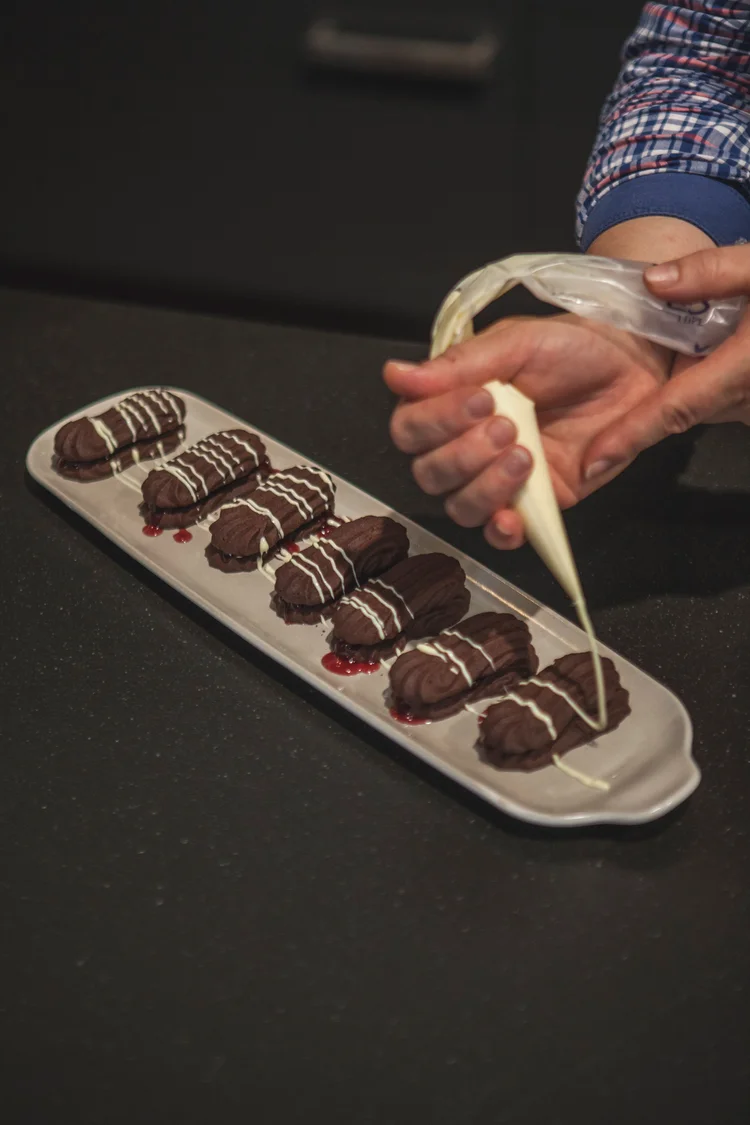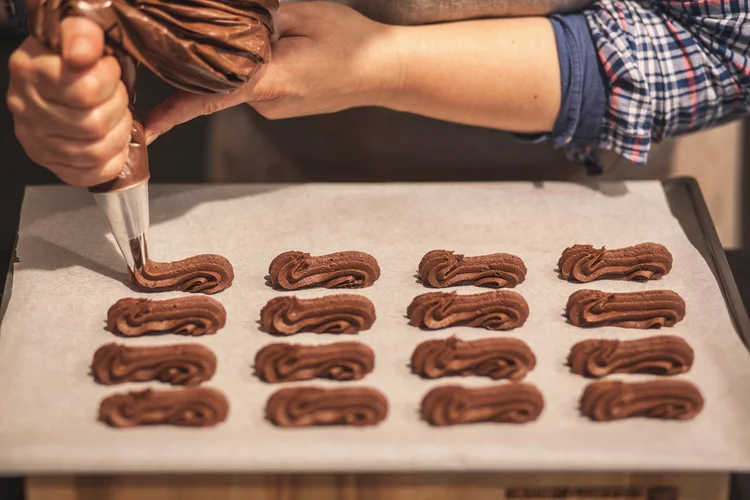 4. A pomocou cukrárskeho vrecka striekame cesto na plech. S cestom pracujeme veľmi rýchlo, aby sa nezaparilo ...