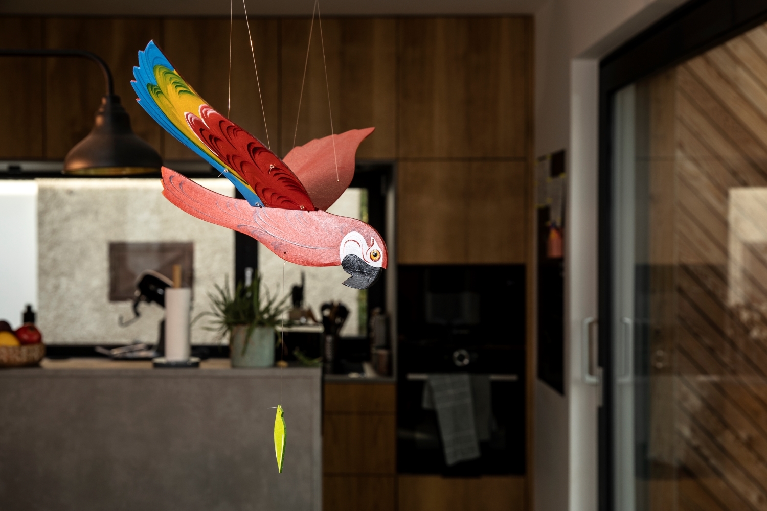 Drevený vták dovezený z Ria de Janeira. Funguje aj proti nárazom vtáctva na našu presklenú stenu.