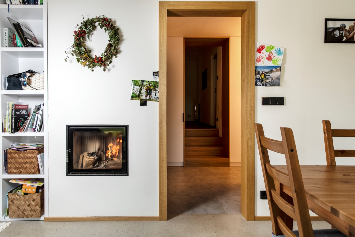 Prechod okolo krbu, do chodby a spální. Interiérové drevo je z dubu.