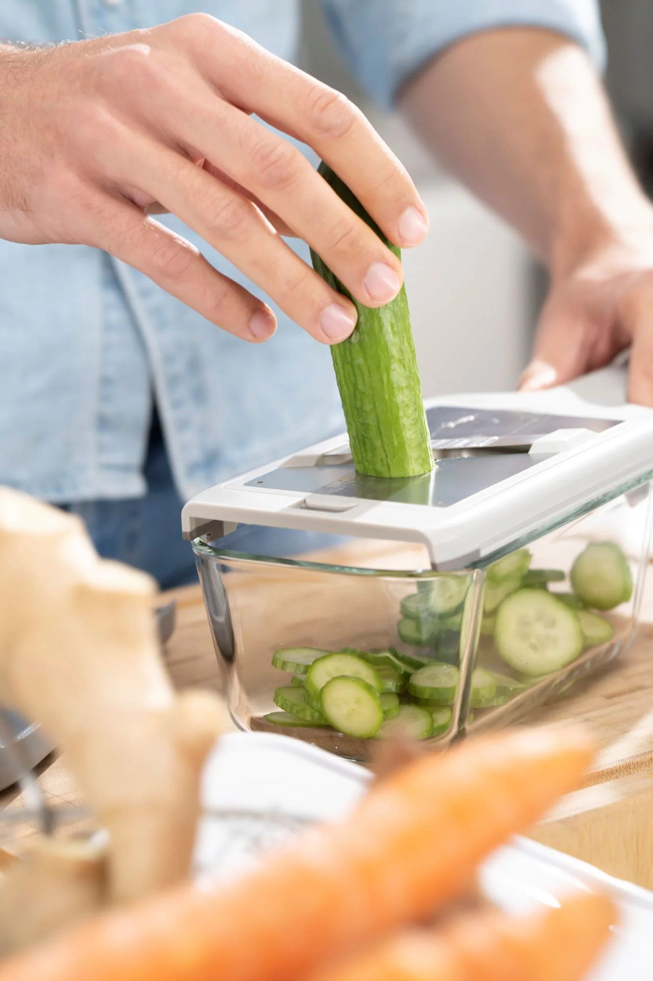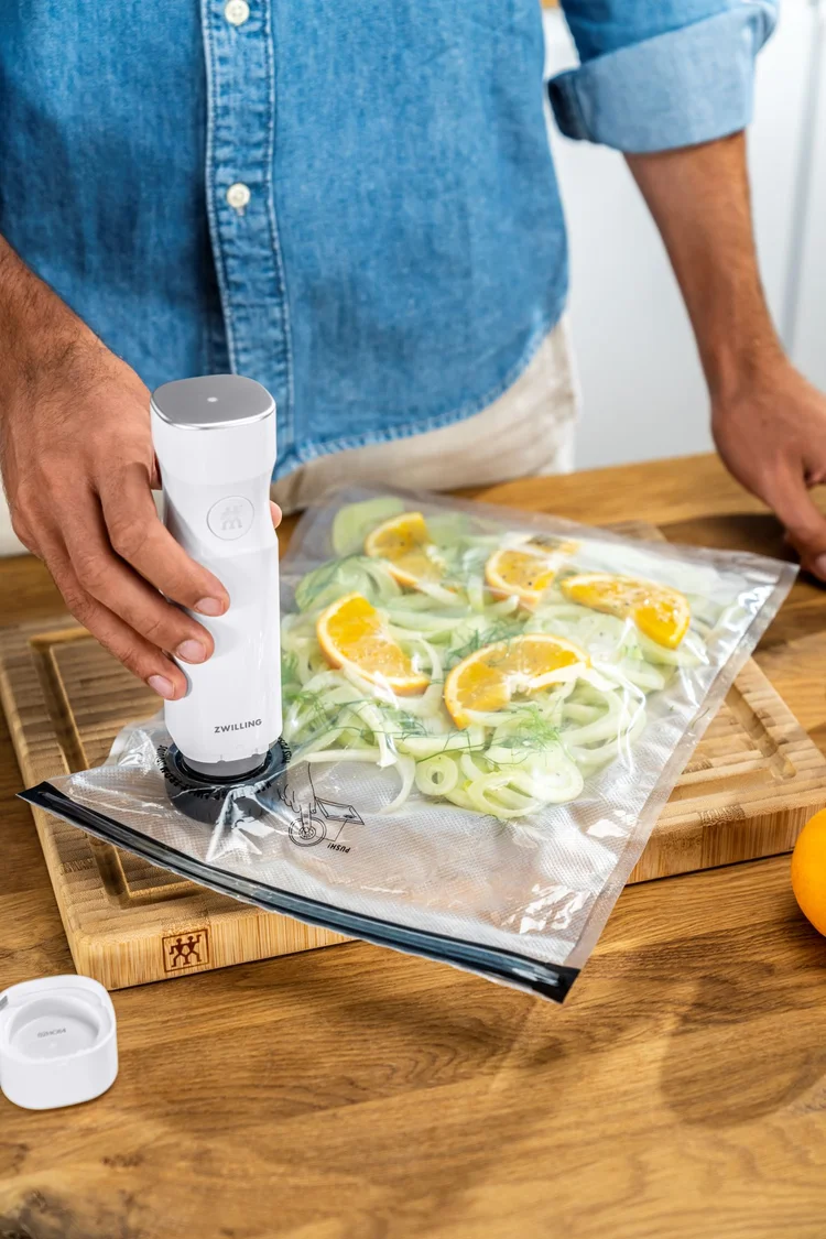 Pri vákuovaní putujú potraviny či hotové jedlá do nádoby alebo do vrecka, z ktorých následne úplne odsajete vzduch. Kyslík je zodpovedný za všetky nežiaduce chemické zmeny v potravinách – množenie mikroorganizmov a plesní, zažltnutie tuku i stratu chuti a vône. Vákuovať sa dá takmer všetko, od mäsa a rýb cez hotové jedlá až po múčniky. Ideálnym spoločníkom do domácnosti je napríklad vákuovacia sada Zwilling Fresh & Save, ktorá uchováva hotové jedlá aj čerstvé suroviny pri skladovaní v chladničke až päťkrát dlhšie čerstvé. Benefitom je v tomto prípade aj smart aplikácia v telefóne, ktorá vás v predstihu upozorní na blížiaci sa dátum spotreby jedla, a dokonca poradí so zdravým a chutným receptom z už získaných ingrediencií.