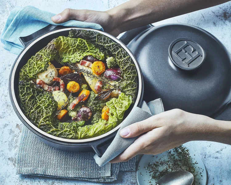 Zapekacia forma s vekom je praktickým spoločníkom, pokiaľ vami pripravovaný pokrm vyžaduje dusenie. Vďaka pevne uzatvárateľnému veku dobre uchováva vlhkosť a udržuje pokrm jemný a šťavnatý. Navyše udržuje teplo a hotový pokrm môžete servírovať priamo z nej. Formy s vekom sú ideálne na pečenie marinovaných kurčiat, rýb, vegetariánskych pokrmov, ale aj tradičného hovädzieho gulášu. Pri výbere tejto nádoby dajte pozor na to, aby bolo jej veko pevne uzatvárateľné a tesnenie kvalitné.