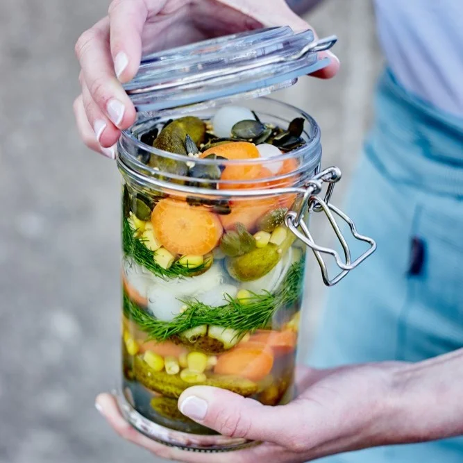 Na prípravu fermentovanej zeleniny kimchi môžete využiť Kilner sety pre fermentáciu. Pripravené kimchi najlepšie uchováte v zaváracích pohároch Kilner, v ktorých pripravená lahôdka aj skvelo vyzerá. Zároveň sa dajú opakovane umývať v umývačke riadu – čo je ich ďalšie plus.Tieto poháre od britskej spoločnosti Kilner sú na celý život, a že teda naozaj niečo vydržia, naviac majú aj tradíciu, ktorá vo Veľkej Británii siaha až do roka 1842.