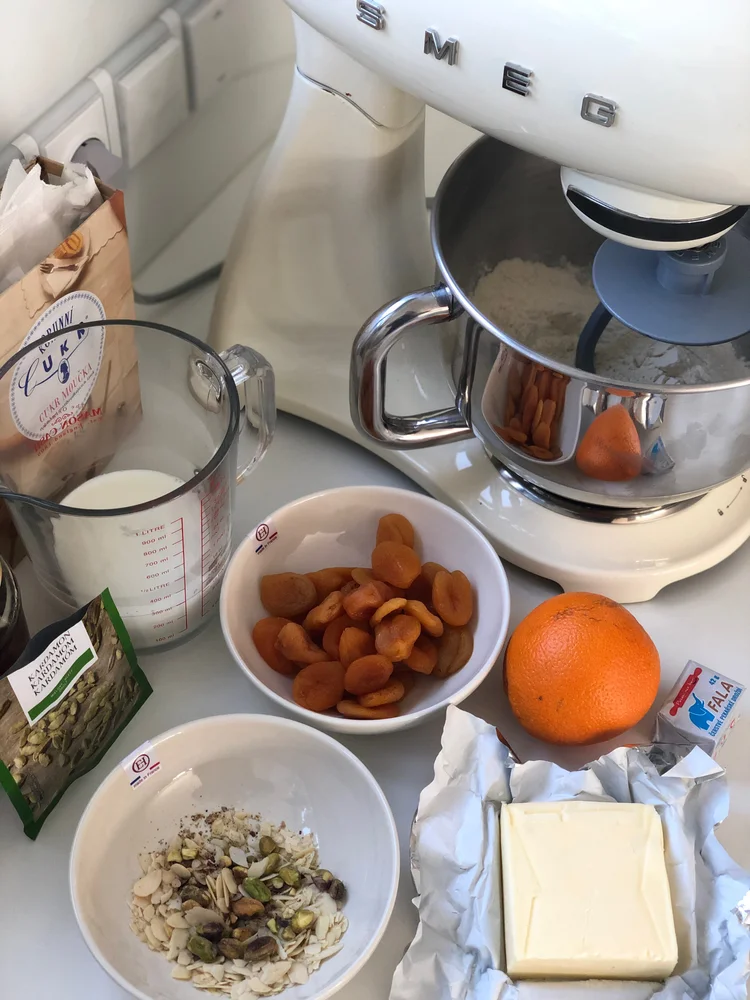 1. Do misy na prípravu cesta pridajte všetku múku, rozdrobené droždie a zalejte vlažným mliekom. Potom pridajte med, cukor, soľ, nastrúhanú pomarančovú kôru, vajce a korenie. Všetko dobre premiešajte. Nakoniec pridajte do cesta kúsky zmäknutého masla a hneťte do hladka.