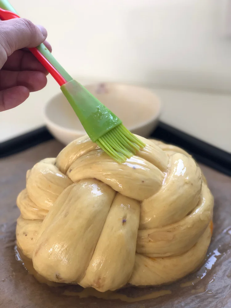 - Výsledný vrkoč zmotajte dokopy do tvaru gule a nechajte na plechu s papierom na pečenie ešte chvíľku, cca 5-10 minút vykysnúť.